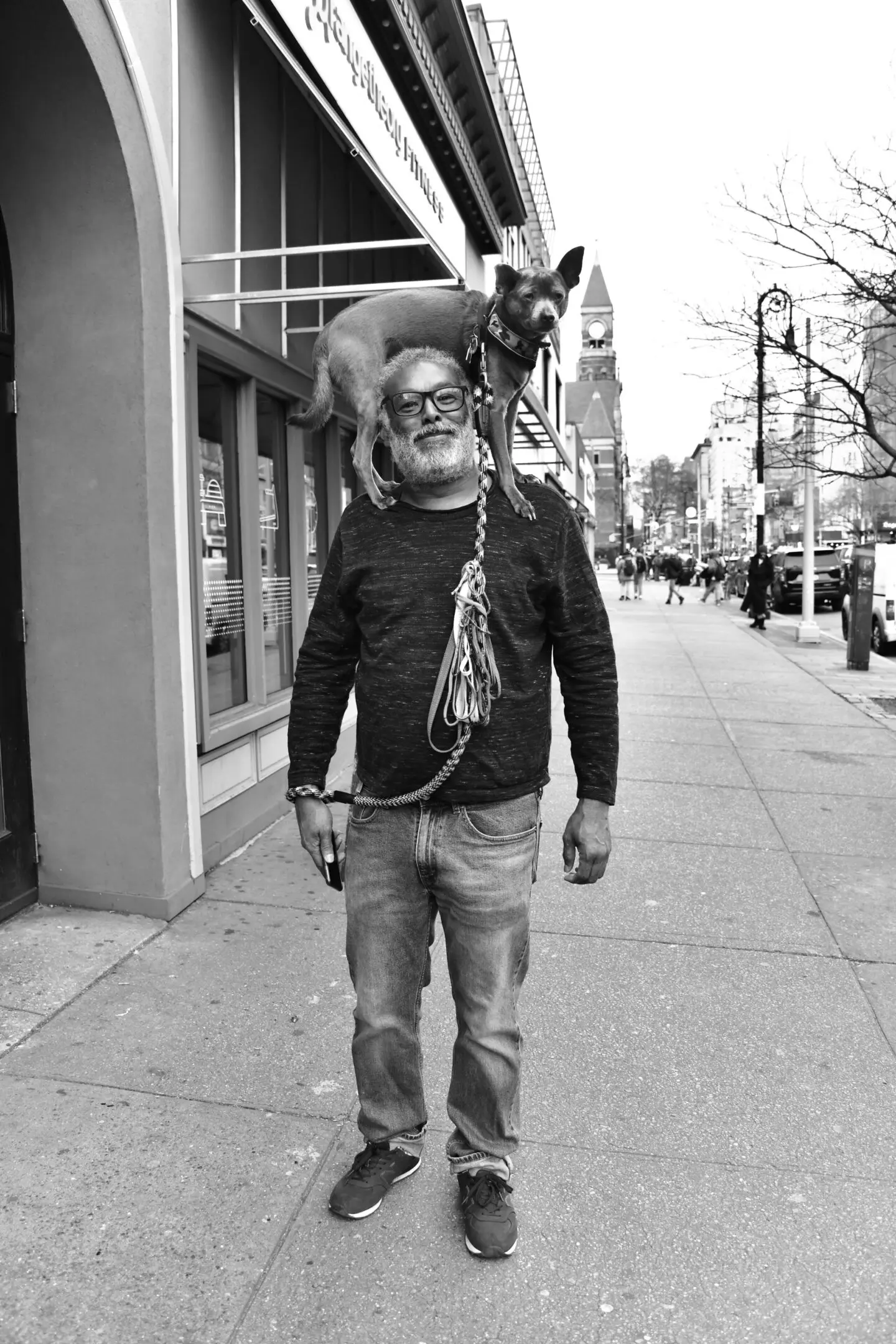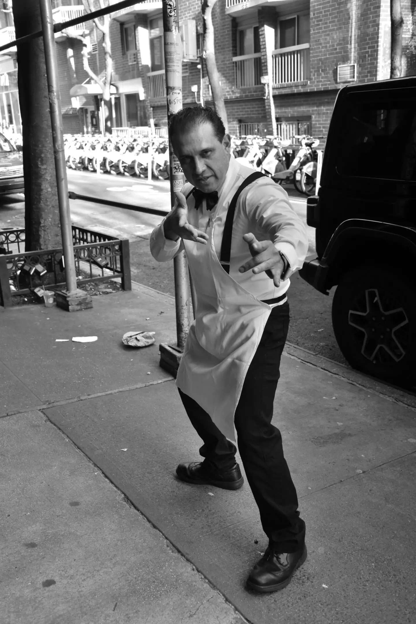 Man in apron striking a playful martial arts pose on the sidewalk.