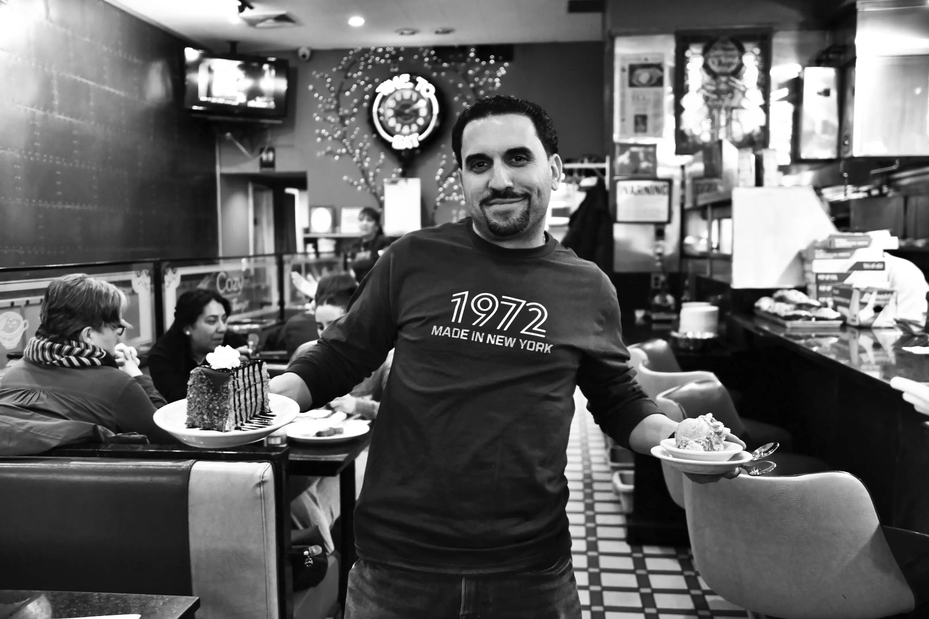 Man in a casual shirt serving food and drinks in a lively restaurant.