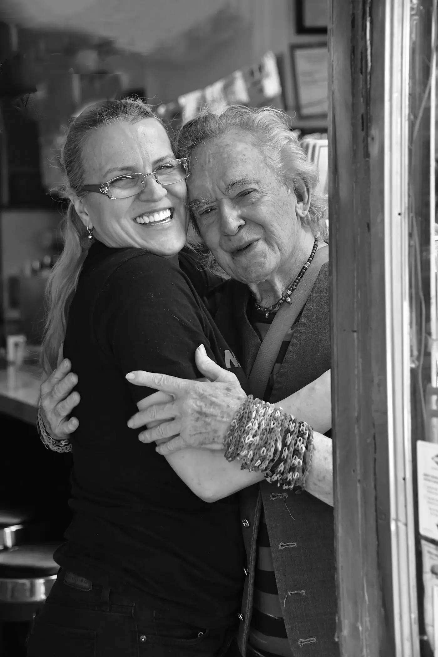 Two smiling women warmly embrace each other in a heartfelt hug.